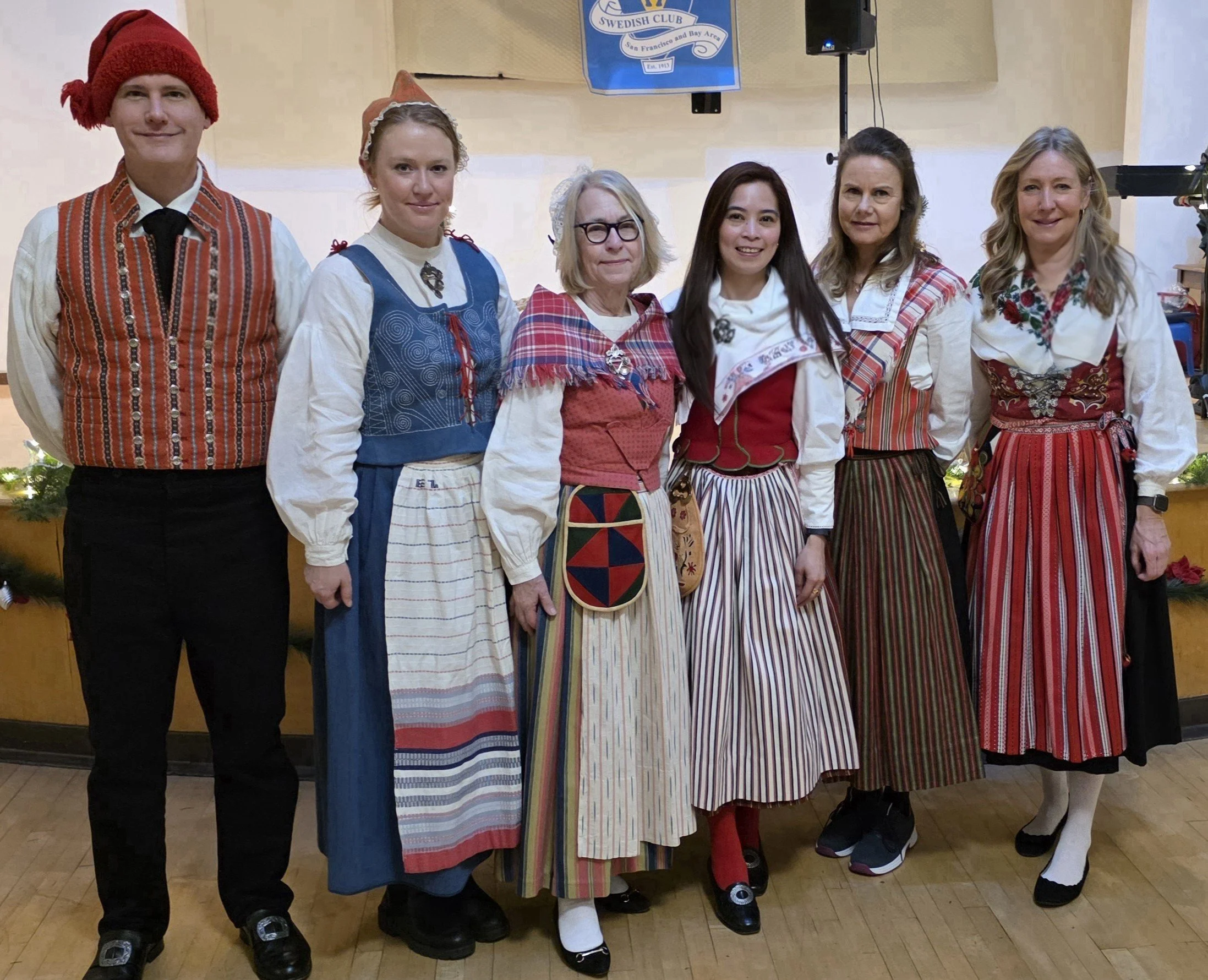 We were fortunate to be able to enjoy several gorgeous folk costumes. Two from Småland (Visingsö and Östbo, 2nd and 3rd from left, respectively), Skedevi from Östergötland (4th from left), Färila from Hälsingland (2nd from right) and the famed Leksand from Dalarna (far right), which has some of the finest embroidery work of any Swedish folk costume.